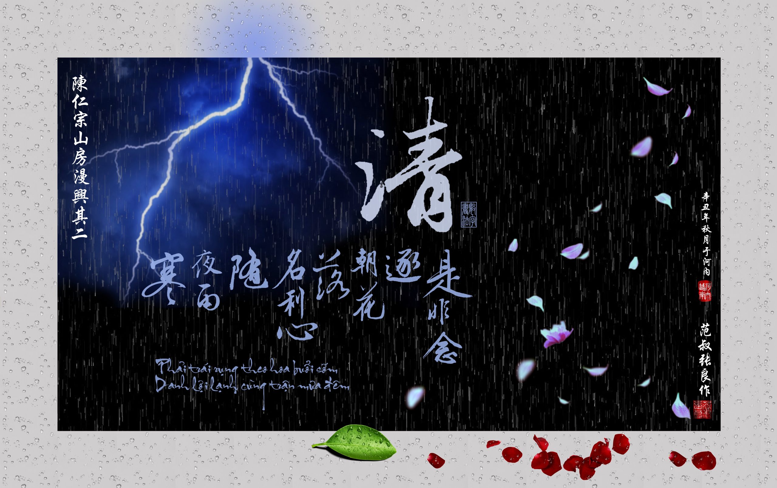 山房漫興其二 陳仁宗 是非念逐朝花落, 名利心隨夜雨寒。 花盡雨晴山寂寂, 一聲啼鳥又春殘。 Sơn phòng mạn hứng kỳ 2 Trần Nhân Tông Thị phi niệm trục triêu hoa lạc, Danh lợi tâm tuỳ dạ vũ hàn. Hoa tận vũ tình sơn tịch tịch, Nhất thanh đề điểu hựu xuân tàn. Dịch nghĩa: Niềm thị phi rụng theo hoa buổi sớm, Lòng danh lợi lạnh theo trận mưa đêm. Hoa rụng hết, mưa đã tạnh, núi non tịch mịch, Một tiếng chim kêu, lại cảnh xuân tàn. Dịch thơ (Đỗ Văn Hỷ): Mạn hứng tại sơn phòng kỳ 2 Phải trái rụng theo hoa buổi sớm, Lợi danh lạnh với trận mưa đêm. Hoa tàn, mưa tạnh, non im lắng, Xuân cõi còn dư một tiếng chim. Giải thích: Kích thước tranh: 95x60cm Đây là một trong những tranh thư pháp đầu tiên của tác giả, và nếu nhìn lại thì cũng là những bức sớm nhất định hình phong cách sáng tác xuyên suốt về sau. Bức tranh minh họa cho cặp câu đầu của bài thơ "Sơn phòng mạn hứng kỳ 2". Trong đêm mưa ào ạt, ánh chớp xé ngang trời như một khoảnh khắc bừng sáng của tư duy. Nổi bật trên nền đen sâu thẳm, chữ “清” (thanh) nghĩa là trong sạch, được chọn làm chủ đề như tâm ý chính của bài thơ. Sau khi thị phi và danh lợi tan đi, điều lắng đọng là sự trong vắt của tâm hồn. Những cánh hoa bay thể hiện rằng ý niệm thị phi (đúng sai) vốn mong manh, sẽ như những cánh hoa rụng đừng nên chấp trước. Còn tâm danh lợi, dẫu có khởi lên như lửa nóng thì cũng sẽ tàn nguội trong cơn mưa đêm lạnh lẽo. Khung cảnh bão tố không phải mô tả thiên nhiên mà là nội tâm đang trải qua một cuộc trút bỏ dữ dội.